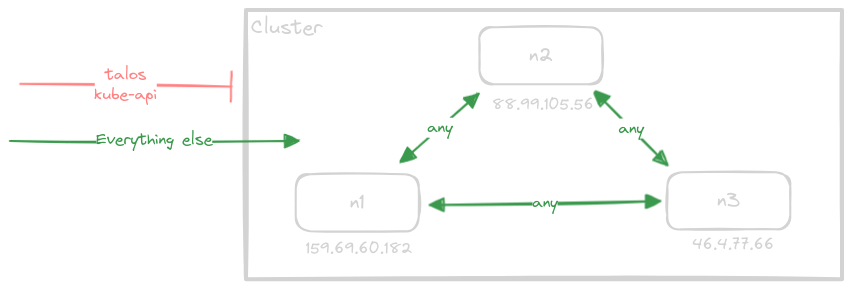 Inter-node communication happens over public IPs. No private networking is configured, and therefore, each node in the cluster is configured to explicitly block access to the Talos (50000-50001/tcp) and Kubernetes API (6443/tcp) ports from anything but the nodes within the cluster and the work station we’ll be using to access the cluster.